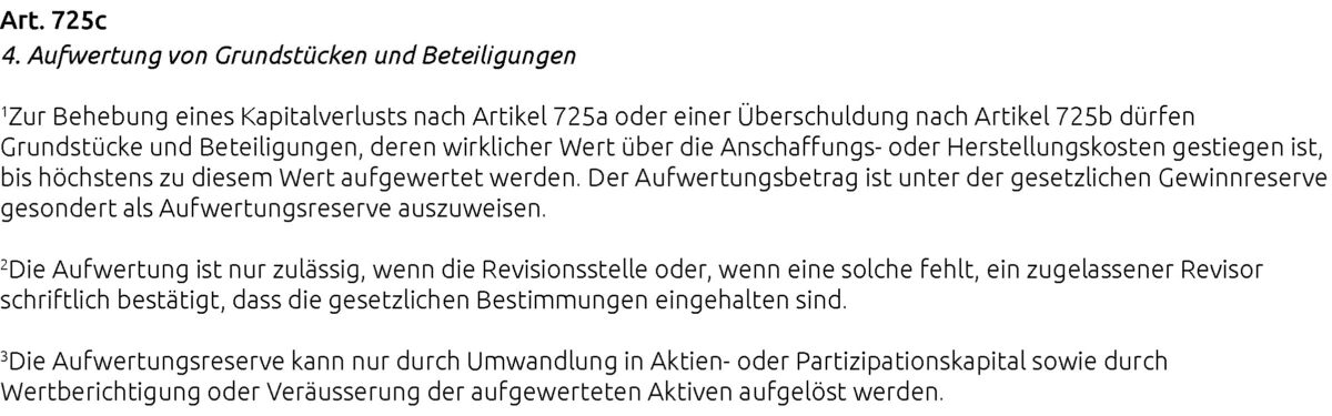 Zur Behebung eines Kapitalverlusts nach Art. 725a OR oder einer Überschuldung nach Art. 725b OR, dürfen Grundstücke und Beteiligungen aufgewertet werden. Voraussetzung ist, dass ihr wirklicher Wert über den Anschaffungs- und Herstellkosten liegt. Somit handelt es sich um eine erlaubte Bilanzkosmetik und nicht um eine finanzielle oder organisatorische Sanierungsmassnahme.