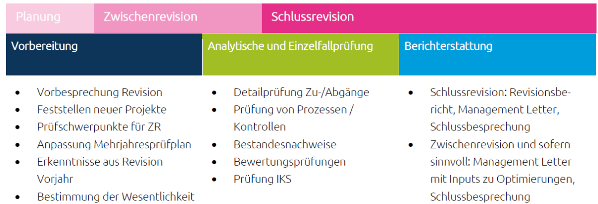 Wir prüfen Vorsorgeeinrichtungen mit einem risikoorientierten Prüfansatz. Dies setzt ein vertieftes Verständnis der entsprechenden Vorsorgeeinrichtung und der Vorsorgewelt insgesamt voraus. Der Ablauf der Revision lässt sich typischerweise in folgende Phasen unterteilen: